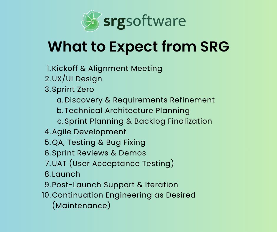 If a project has not yet done this work, and if you don’t know where to start, SRG would organize a design sprint, which is a structured, time-boxed process that helps founders move from a vague idea to a validated concept quickly. Rather than spending weeks debating features or months building the wrong solution, a design sprint lets you test your product direction before writing a single line of code. It can clarify your product vision and align your team and development partner. A design sprint can be as short as a week or as long as it takes to define your product.
